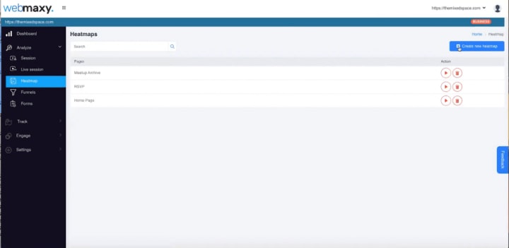 Heatmaps: It is a graphical representation of where your users/visitors click. You can create heatmaps in Webmaxy by navigating to Analyze>Heatmap. Simply click on the “Create a heatmap” button at the top right.