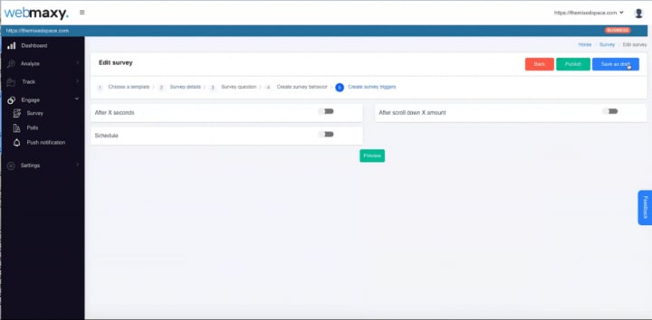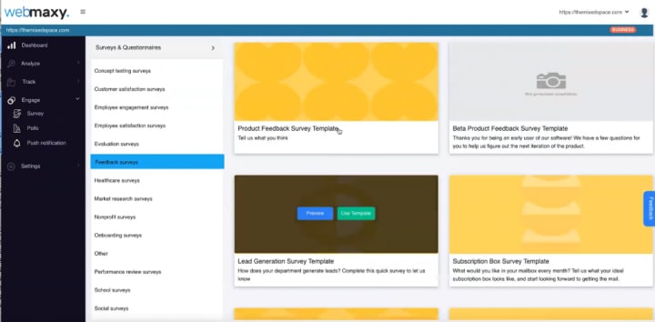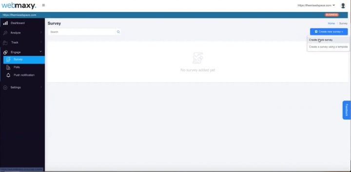 Surveys: Webmaxy offers a lot of templates that enable you to build surveys in minutes. Go to Engage>Survey and click on the “Create new survey” at the top right.