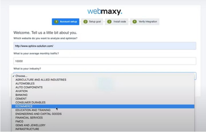 After you are in your Webmaxy account, enter your website’s URL, average monthly traffic, and the industry you are in. This is the first of the four steps of your onboarding.