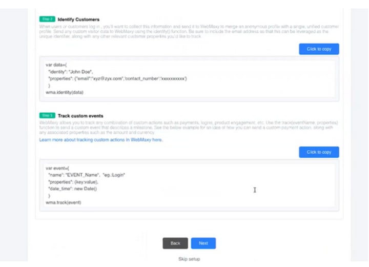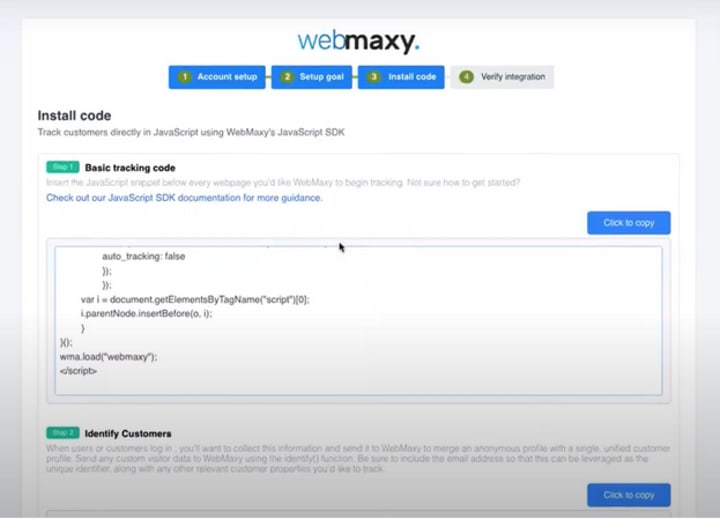 The third step of the onboarding process involves you pasting a JavaScript (JS) code on your website. This JS code sends relevant data to Webmaxy which will create your heatmap.