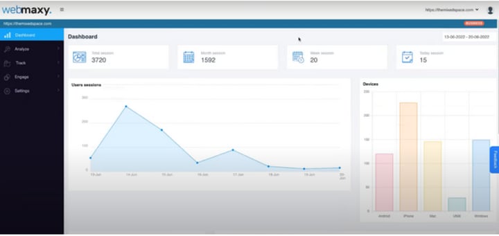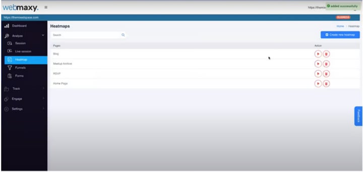 Here you will find all the features of Webmaxy. Click on “Analyze” which will open a dropdown showing all the website analysis tools. Click on the “Heatmap” option on the left hand side menu bar.
