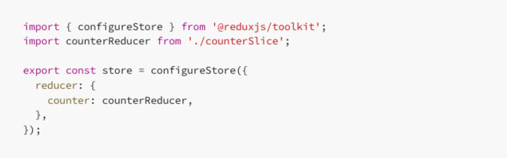 Here, we’re using the configureStore function from Redux Toolkit to create a new store. We're also importing a counterReducer function from a file called counterSlice.js. We'll create this file in the next step.