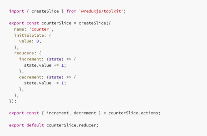 Here, we’re using the createSlice function from Redux Toolkit to create a new slice. We're defining the slice name as 'counter' and setting the initial state to an object with a value property set to 0. We're also defining two reducer functions, increment and decrement, that update the value property of the state.