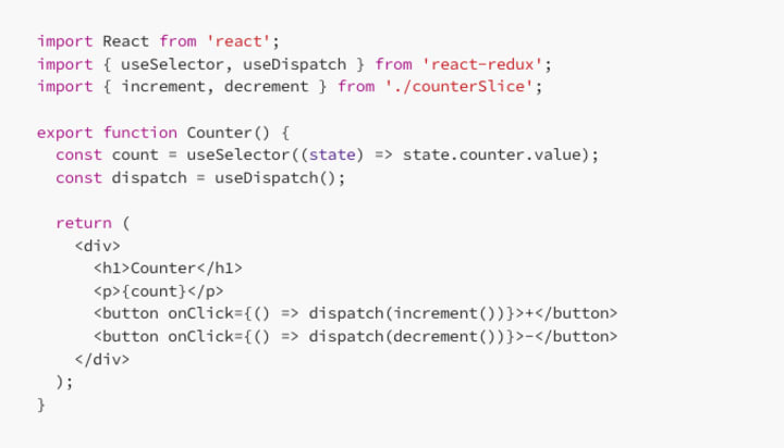Here, we’re using the useSelector hook to get the current value of the counter from the store. We're also using the useDispatch hook to get a reference to the dispatch function, which we can use to dispatch the increment and decrement actions to the store.
