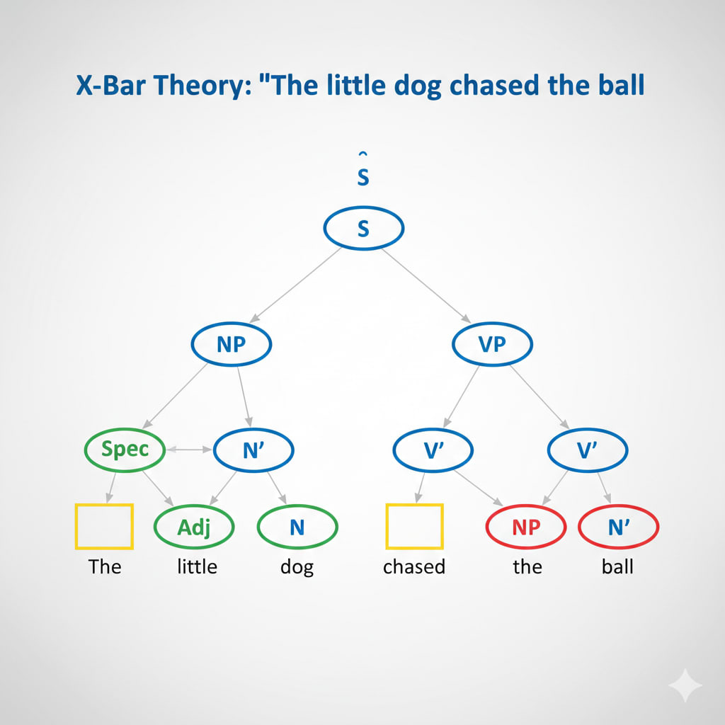 X-Bar Theory, developed in the 1970s, is a way to analyze sentence structure hierarchically. Instead of seeing sentences as flat strings of words, X-Bar Theory breaks them into layers of phrases, showing how smaller units (words) combine to form larger units (phrases and clauses). The “X” represents any syntactic category (like N for noun, V for verb, A for adjective), and the “bar” indicates levels within the phrase.