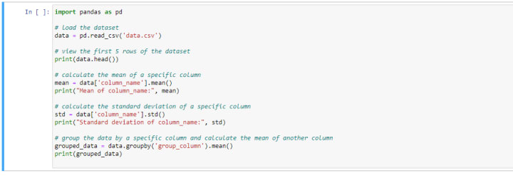 - The program calculates the standard deviation of the column specified by the column_name using the data['column_name'].std() function.