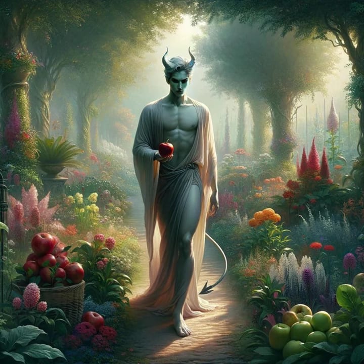 On the way back to Hell, Satan sees the other fallen angels and enters the body of a sleeping serpent. At midnight, he slithers through the undergrowth, avoiding the angels guarding Adam and Eve. Satan hides behind the Tree of Knowledge and waits for the angels to leave at dawn.