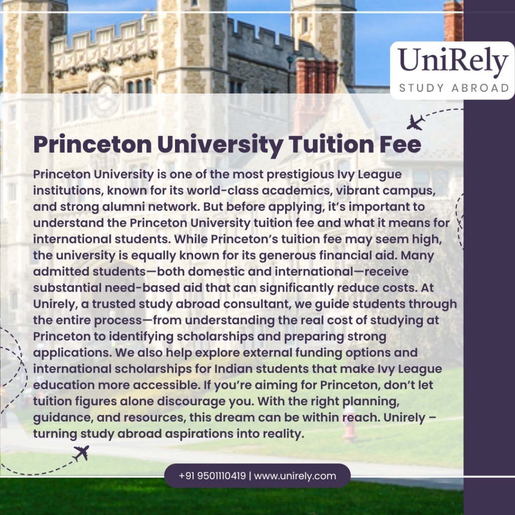 Princeton University is one of the most prestigious Ivy League institutions, known for its world-class academics, vibrant campus, and strong alumni network. But before applying, it’s important to understand the Princeton University tuition fee and what it means for international students. While Princeton’s tuition fee may seem high, the university is equally known for its generous financial aid. Many admitted students—both domestic and international—receive substantial need-based aid that can significantly reduce costs. At Unirely, a trusted study abroad consultant, we guide students through the entire process—from understanding the real cost of studying at Princeton to identifying scholarships and preparing strong applications. We also help explore external funding options and international scholarships for Indian students that make Ivy League education more accessible. If you’re aiming for Princeton, don’t let tuition figures alone discourage you. With the right planning, guidance, and resources, this dream can be within reach. Unirely – turning study abroad aspirations into reality.