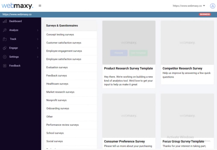 WebMaxy Analyzer can help you conduct different types of customer surveys. It has many pre-designed templates with well-researched questions that you can utilize directly.