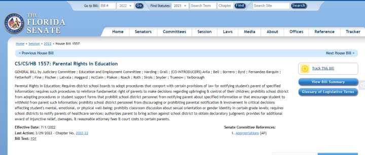 And that, my friends, is the entirety of Florida’s HB 1557. The cover page, which includes the summary I quoted, can be found here: The Florida Senate — Parental Rights in Education.