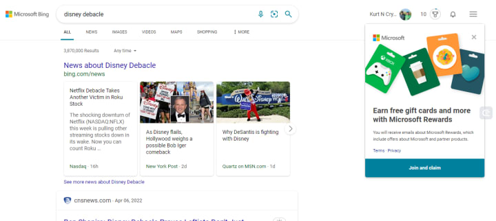 This experiment should be carried out in two parts. First, using the Google search engine, simply search the keywords ‘Disney debacle’. Then do the same thing using Microsoft’s Bing search engine. And lastly, do it using Yahoo search.
