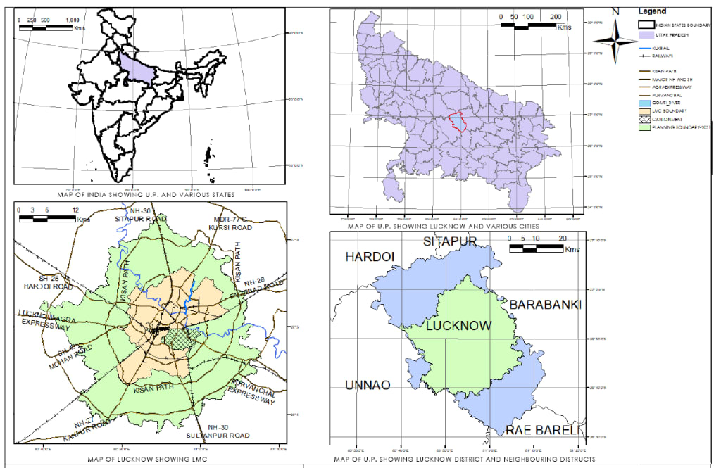 Lucknow by virtue of its central location was selected as the capital and seat of administration for Uttar Pradesh-the largest populated state of India. It is located between 26 30`N and 27 10`N latitude and 80¹ 30°E and 81' 31'E longitude, in the middle of Gangetic Plain on the banks of river Gomati. Location Map of Lucknow is given at Map 2.1. The river meanders through the city and geographically almost bifurcates it into two parts: the Trans-Gomti and CIS-Gomti (sub-city in Lucknow) regions, the first part forming the core of Nawabi and British evolution of the city structure and form, while the second half is urban sprawl of post-independent evolution of the city structure and form.