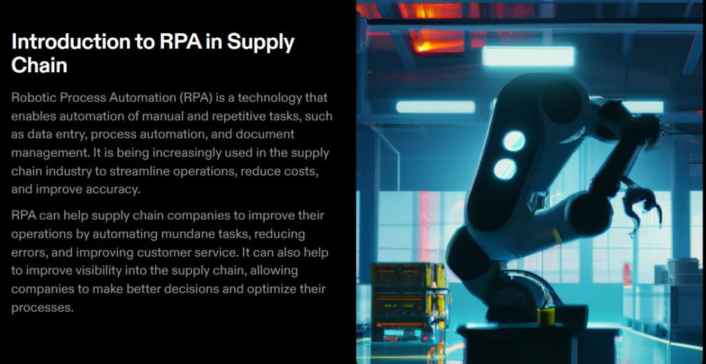 RPA, or Robotic Process Automation, is the use of software to automate repetitive, routine tasks typically performed by humans. In the supply chain, RPA can be used to automate tasks such as data entry, invoice processing, and order tracking. This can help improve efficiency, reduce errors, and free up staff to focus on higher-value tasks. Additionally, RPA can also be used to automate communication and coordination between different parts of the supply chain, such as between suppliers and manufacturers. Overall, RPA can provide significant benefits for supply chain management, including cost savings and improved accuracy and speed.