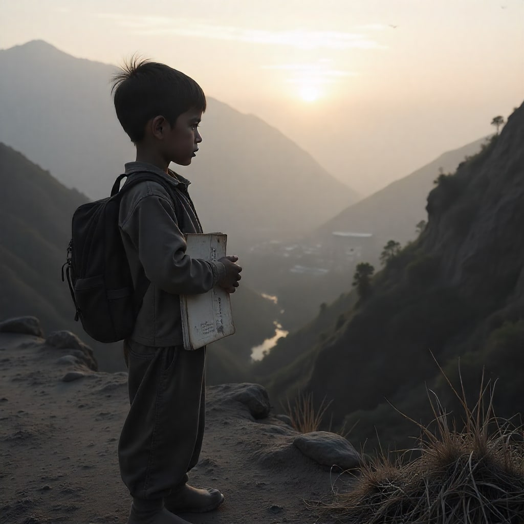 In a quiet mountain village, far from the roads and noise of busy towns, lived a young boy named Rahim. His village rested high on a hill surrounded by forests, steep rocky paths, and the sound of wind whistling through the trees. Life was peaceful but hard. There were no hospitals, no shops, and no school.