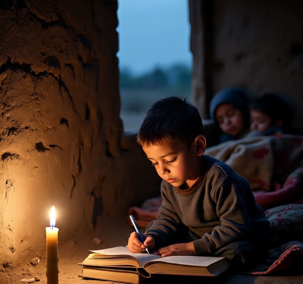 One evening, a storm knocked out the village’s electricity. The whole village plunged into darkness, and Amir’s candle was gone. Determined not to miss a single night of study, Amir went to the mosque, where the imam allowed him to sit under the small solar bulb near the entrance. There, surrounded by the soft recitation of prayers and the steady patter of rain, Amir solved math problems and memorized grammar rules.