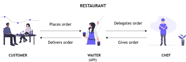What observations do we make? The communication is indirect, with the API acting as the "middleman." During transmission, we only interact with the API layer that links the endpoints; in this context, an endpoint is a URL that provides the location of a resource on the server.
