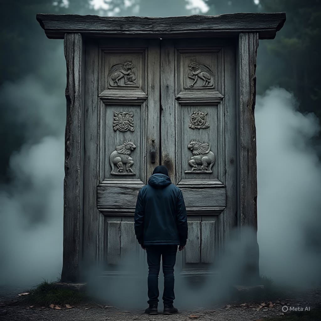 Still no answer. But this time, you notice the door is solid—oak, carved with strange symbols. It’s old, but not broken. It’s guarded, but not locked. You hear a faint echo behind it: not a voice, but a feeling. A whisper of possibility.