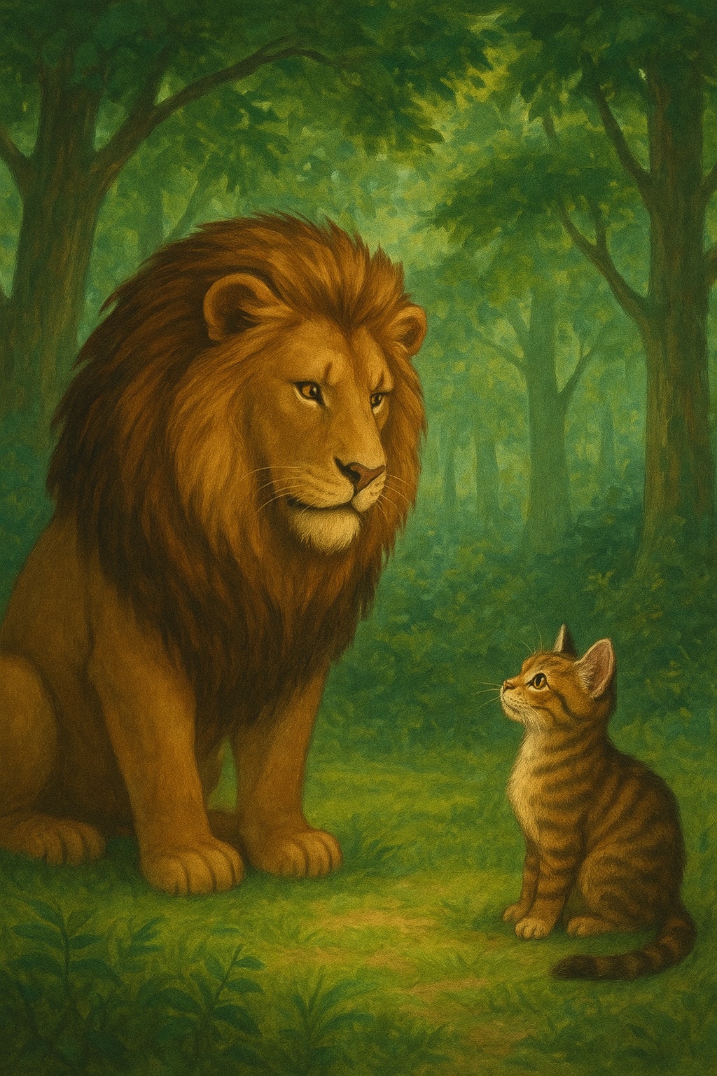 One sunny afternoon, while the lion was resting under a large tree, a small cat walked toward him slowly. With respect in her voice, she said,