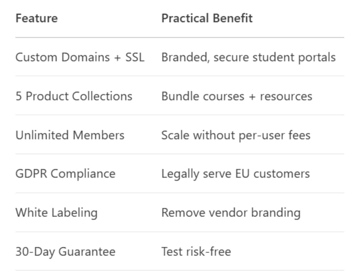 - 4+ tools (payment processor, course host, member portal, content locker)