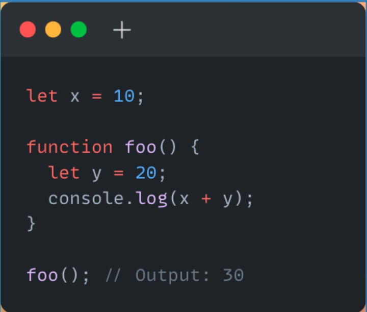 In this example, the execution context for the foo() function is created when it is called. The scope chain for this execution context includes the variable object for the foo() function and the global variable object. When the console.log() statement is executed, the JavaScript engine first looks for the y variable in the variable object for the foo() function. Since it is found, the value of y is added to the value of x (which is in the global scope) to produce the output of 30.