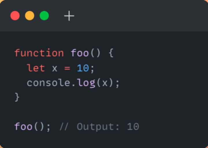 In this example, the execution context for the foo() function is created when it is called. During the creation phase of the execution context, the JavaScript engine creates a variable object for the function. This variable object contains a reference to the function itself (foo) and a reference to the variable x. During the execution phase, the console.log() statement references the x variable, which is found in the variable object for the foo() function, and its value of 10 is outputted.