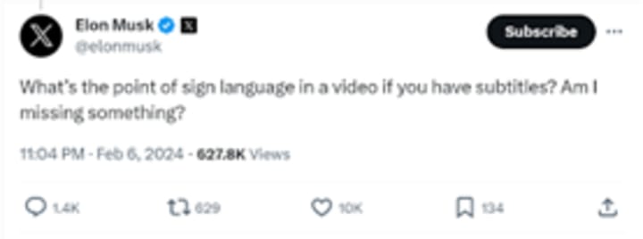 Challenge your thinking and advocate for access to information and spaces to be more Deaf-friendly. You may recall Elon Musk’s tweet going around.