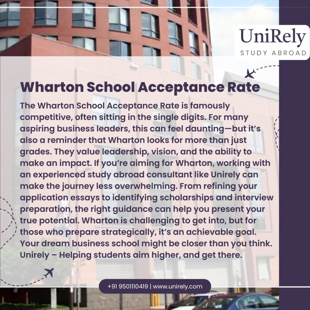The Wharton School Acceptance Rate is famously competitive, often sitting in the single digits. For many aspiring business leaders, this can feel daunting—but it’s also a reminder that Wharton looks for more than just grades. They value leadership, vision, and the ability to make an impact. If you’re aiming for Wharton, working with an experienced study abroad consultant like Unirely can make the journey less overwhelming. From refining your application essays to identifying scholarships and interview preparation, the right guidance can help you present your true potential. Wharton is challenging to get into, but for those who prepare strategically, it’s an achievable goal. Your dream business school might be closer than you think. Unirely – Helping students aim higher, and get there.