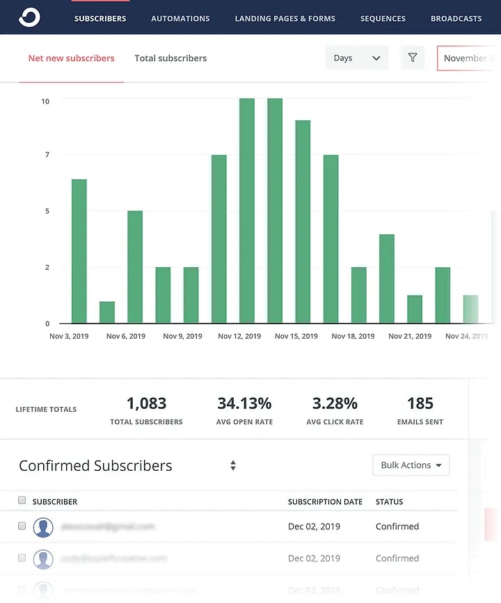1. Subscribers: This tab displays information about the individuals who have subscribed to your email list. It provides valuable data such as total subscriber count, subscriber growth over time, average open rate, average click rate, and total emails sent. It serves as a dashboard for monitoring list growth and subscriber engagement.
