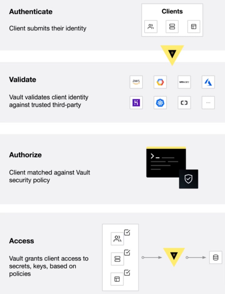 Before providing access to secrets or stored sensitive data, it validates and authorizes clients (users, machines, apps). (as shown below)