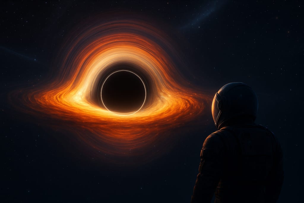 Imagine drifting through the endless dark of space, stars fading behind you, and ahead—an invisible monster: a black hole. It doesn’t shine, it doesn’t reflect light, but you feel its presence. Its gravity stretches space itself, bending everything toward its center. And here’s where the weirdest thing happens: for someone watching from afar, time itself appears to stop.