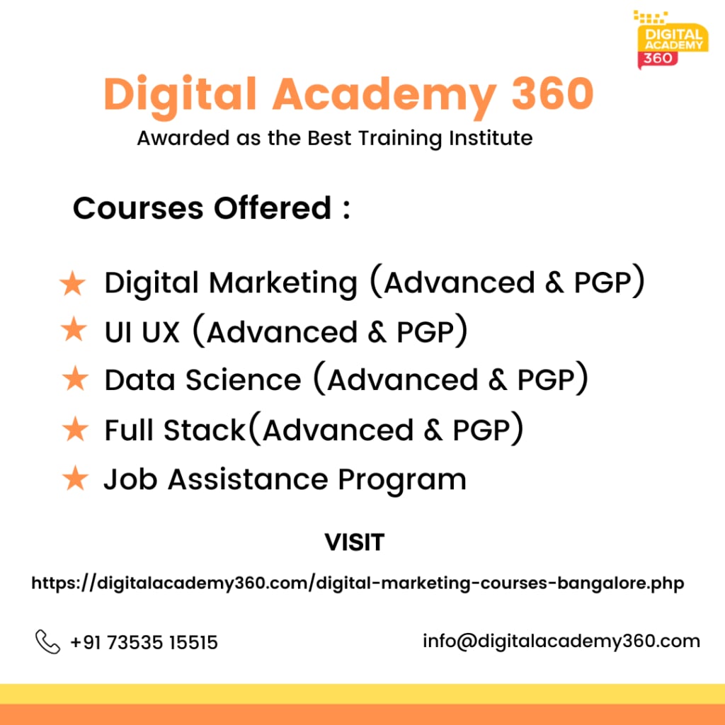 Digital Academy 360 is offering digital marketing courses in Bangalore, take training on 100+ modules, 20+ certifications with affordable fees & placements https://www.digitalacademy360.com/institutes/digital-marketing-courses-bangalore/