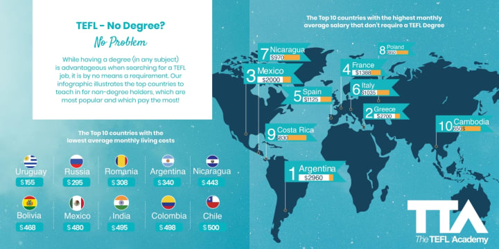 It's a common misconception that you need a degree to teach English abroad when this is simply not true. Here's a helpful infographic which outlines which countries do not require a degree, which countries pay most and which countries have the lowest cost of living.