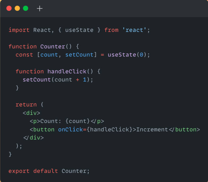 In the example above, we define a Counter function component that uses the useState hook to manage the count state and the setCount function to update the state when the user clicks on the "Increment" button.