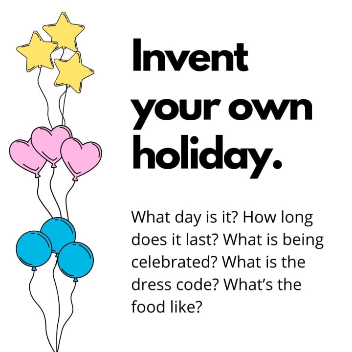 Okay y’all, it’s time to put your thinking caps on once again. Your challenge is to make up your own holiday. What date is it? How long does it last? What is being celebrated? What is the dress code? What’s the food like? Ask yourself these questions (and many more) and create your own holiday.