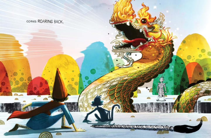Later generations often lose the languages and customs their grandparents and parents arrived with in a new land. That is just what the reader finds in Drawn Together. A young boy spends another afternoon with his grandfather, who speaks another language. The boy wants to watch English television, not this old stuff in a language he can’t understand. But communication isn’t just about words. It’s much deeper than that. Frustrated and bored, the boy begins to draw. Interested, his grandfather watches silently before bringing out a cartography brush. He adds to his grandson’s drawing, and soon the two are off on a great battle of opposites, but this time with art. Soon, their love of drawing bridges the generational and cultural gap, and the two trade their artist's implements and look forward to next week when they can draw again together.
