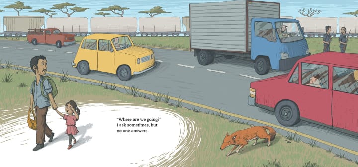 This is the story of a father and daughter as they travel to a new country for a better life. Along the way, the girl counts what she sees, chicken, cows, people, clouds, even the stars, and the moon. Occasionally, she asks where they are going, but no one ever answers.