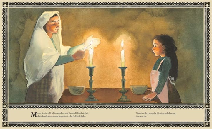 Gittle is a nine-year-old girl who is about to immigrate with her mother to America from Eastern Europe. When they arrive at the harbor to board their ship, Gittle’s mother is denied entry due to an infection in her eye. Gittle must go on alone. Her mother hands her a note with her cousin’s name and address on it. She instructs Gittle to give the note to the immigration agents in America. “He will help you,” her mother assures her. Along with the note, Gittle’s mother gives her the Shabbos candles.