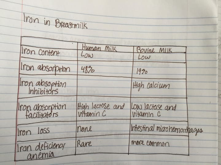 As you can see, the iron absorption rate in human milk is 48 percent! This high rate of absorption is due, in part, to the fact that breast milk contains high levels of lactose and vitamin C, which are iron absorption facilitators. If you take your baby to the doctor for an iron test, and baby's iron levels are low, the doctor may suggest an iron supplement. If baby has started solids, there are lots of foods you can offer that contain iron, and the breast milk that he is taking will help with the iron levels. That's my tangent on iron.