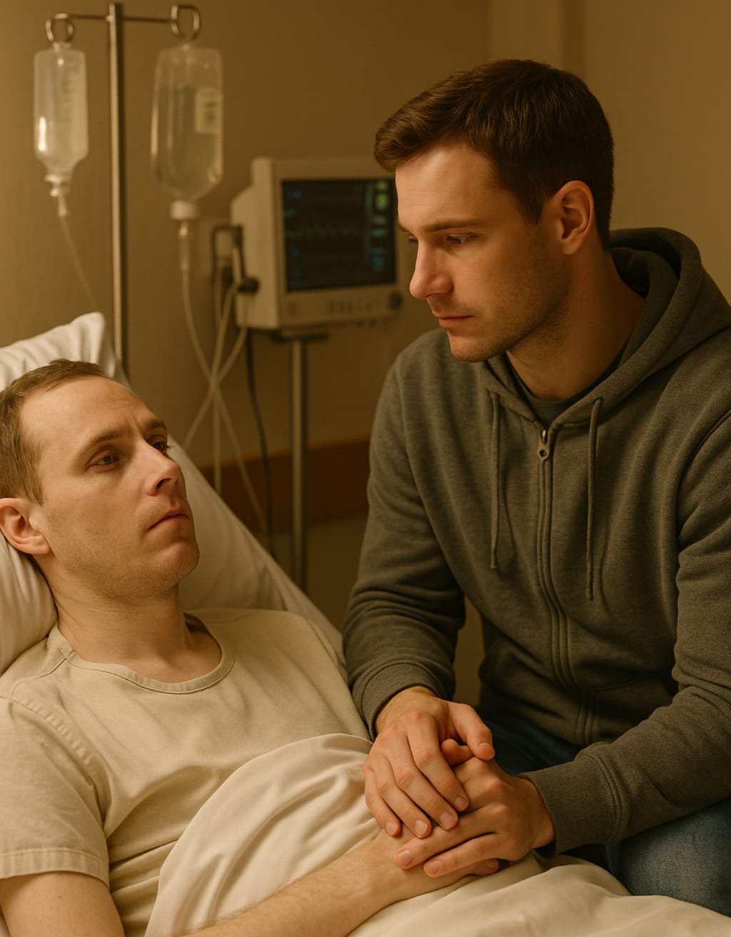 The transplant wasn’t dramatic. A clear bag, dripping into Jake’s vein. No lights, no sirens. Just a quiet hope.The recovery was slow and brutal. Jake’s body was stripped bare — no immune defense, vulnerable to everything. He got infections. He shook through fevers. His mouth blistered from the chemo. Tommy stayed through it all. He brought broth, wiped Jake’s face when he couldn’t move, and sat through nights that felt too long.