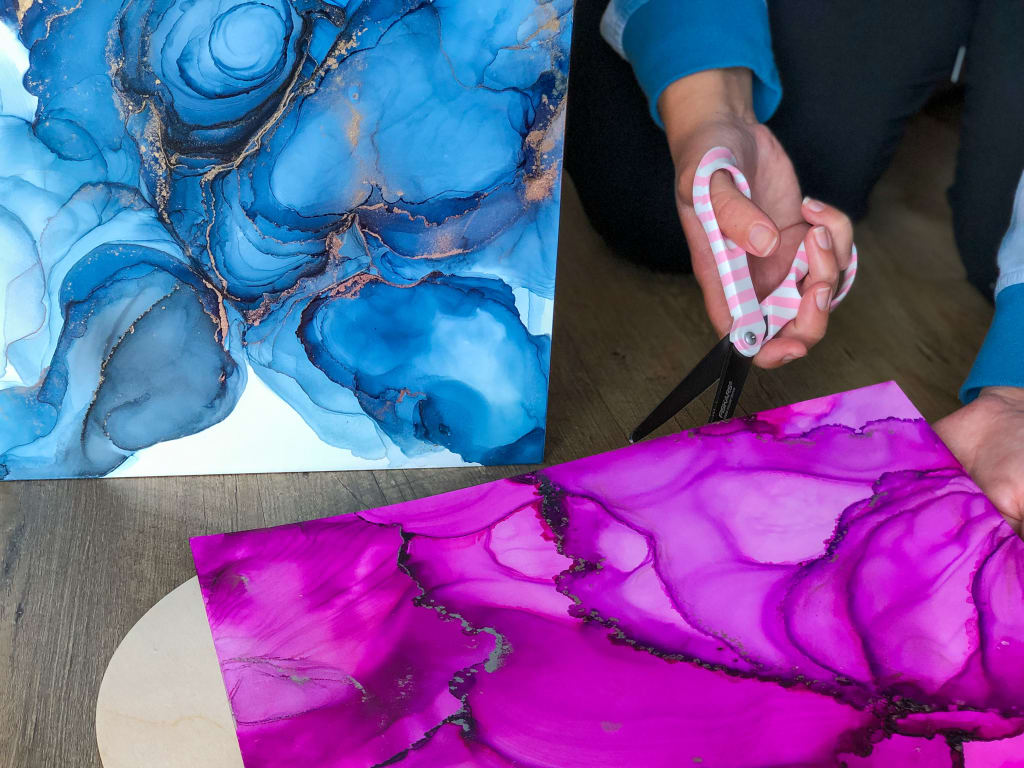 My mother is the most creative person I know. Growing up she used to make clothes for her dolls from fabric scraps. If the scissors in their house were missing, her mom would call out, “Kristie, go clean your room!”. She has instilled that same creativity (and love of scissors) in me, so ever since I can remember, I have loved art. I love to draw, and make things. I was scrolling through Instagram one day and happened upon an artist’s account @_ksenyart_. She was creating the most beautiful pieces using a medium I had never heard of or seen before- alcohol ink. Alcohol ink is a highly pigmented ink mixed with alcohol. Once the alcohol dries, and it does so rather quickly, it leaves behind the dye and some incredible designs! I was immediately inspired to try it out for myself. I guarantee that once you see it, you will want to, too! Alcohol ink was a new and exciting challenge, and I was up for it!