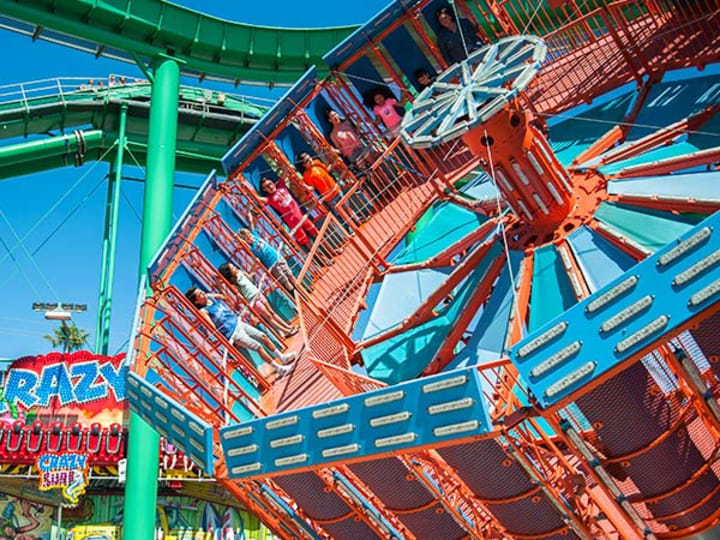 The Cyclone is also a large disk. It has tall walls all around where people stand. The disk rotates and swivels. Centrifugal force causes one to stick to the walls.