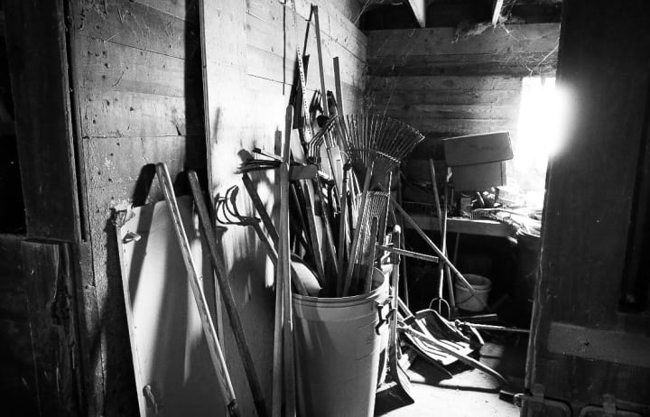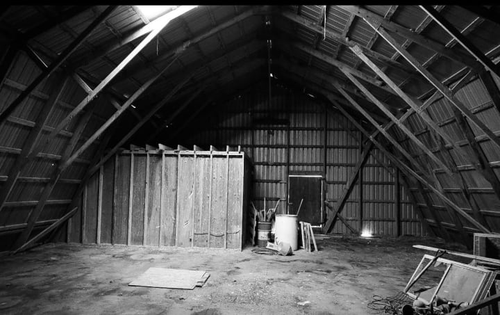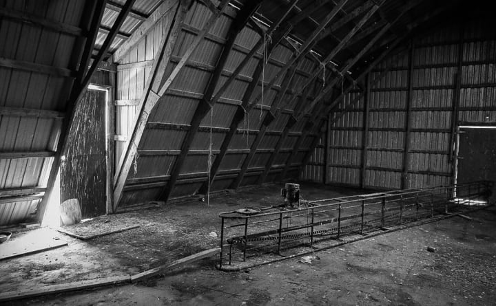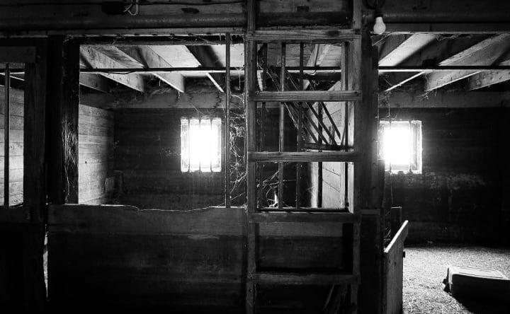 Halfway through, I halt, staring at the ladder to hay loft. I smirk as I peer up through the cloud of dust I had just created. Up at the gaping hole revealing the dingy forbidden realm that plagued my curiosity growing up.