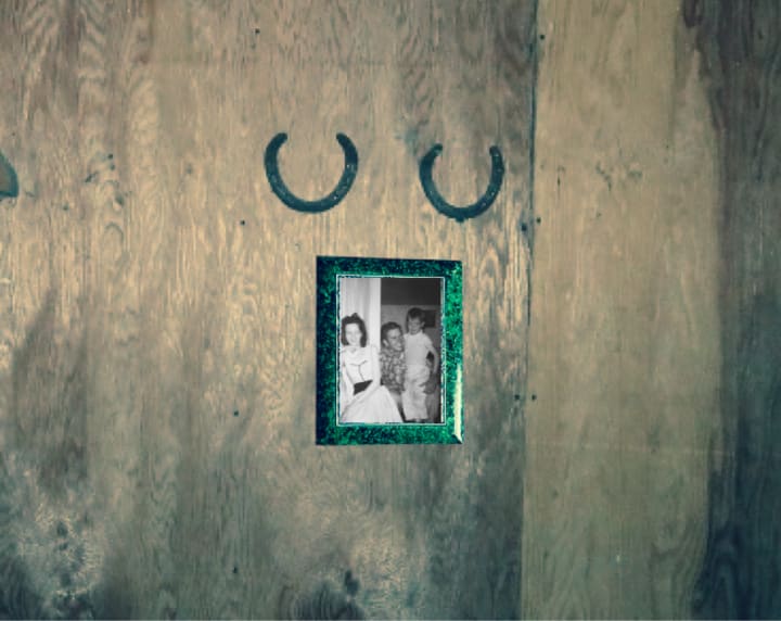 Shining my light on the frame, I wipe away the dust with my sleeve to take a better look. Cheap emerald green plastic masquerading as fine marble framing an old photograph. My grandparents. So young, so full of joy. The sight makes my heart ache.