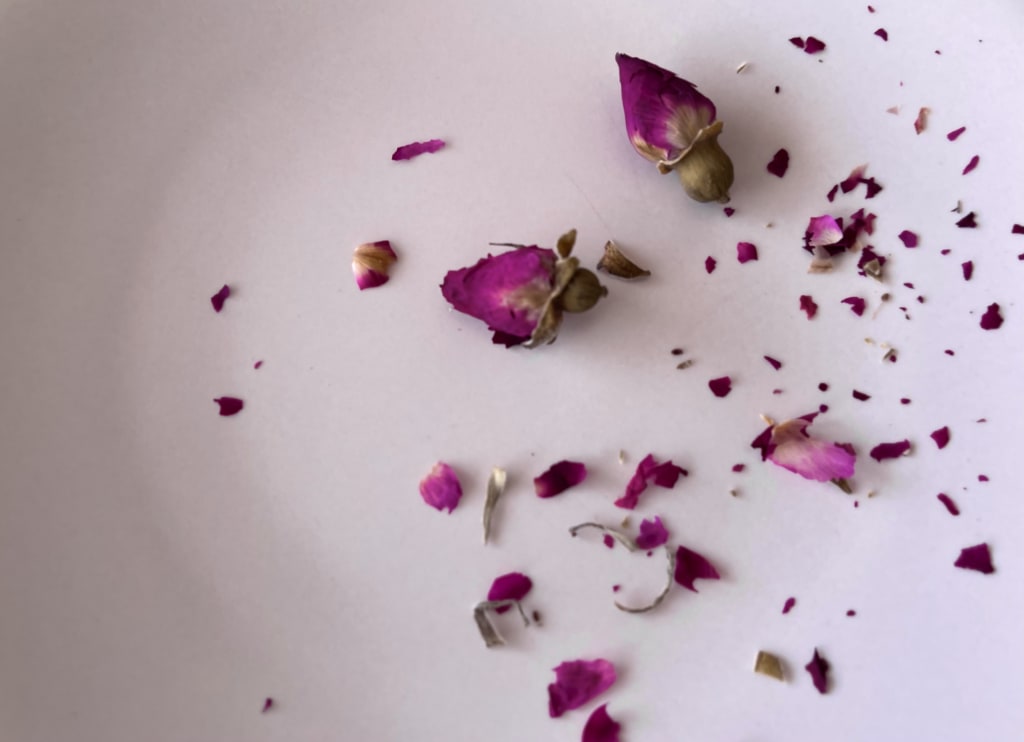 In my kitchen cabinet, I always keep a jar of dried damask roses. They are my staples, I put them in my morning coffee, my oat milk, and I pour hot water on them at night, adding a cardamom pod to make rose tea for bedtime.