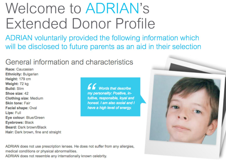 According to the selected criteria, appears a list of donors with for each of them a profile summarized in a form. The basic profile corresponds to the morphological and physiological criteria selected by the user. The price of the gametes is specified, it is a function of the mobility and the concentration of the spermatozoa, the available stock and if it is raw or purified sperm (in order to obtain a greater number of functional spermatozoa and of eliminating toxic or damaging substances) for intrauterine insemination or IVF. Added to this is the donor’s medical record, the result of a genetic screening to exclude those carriers of mutations associated with risks of communicable diseases (the list is on the bank’s website) and a background questionnaire. medical relatives. It is also possible to access when it exists, the extended profile of the donor that contains psychosocial information: a voice recording, photos of his child, a handwritten letter and a self-portrait presenting his family and social identity. Thus, on his Adrian sheet (Figure 2) tells that being an “open” donor he undertakes to reveal his identity (his real name, his address, etc.) to the majority of the child. Thanks to this expanded profile, the Internet user can have the impression of getting to know him: to hear his voice, to read his writing, to know who Adrian is, to know his level of education, his job, what he likes in life and the reason he is a sperm donor.