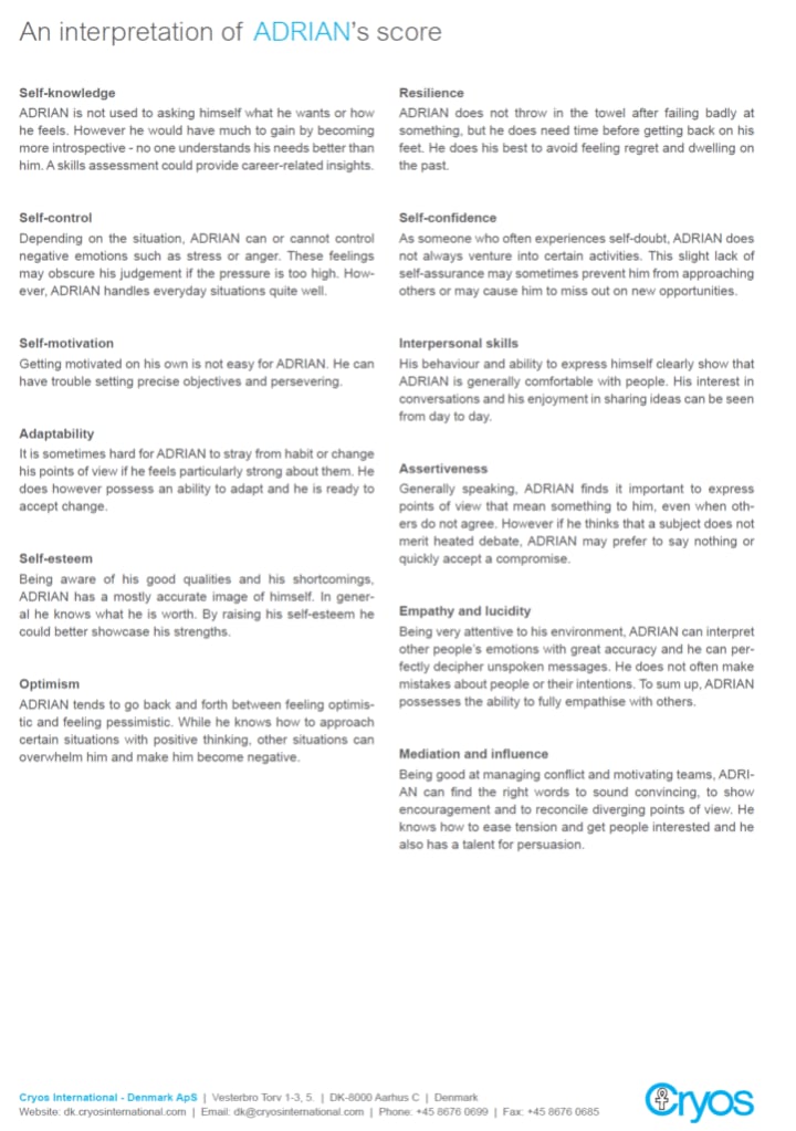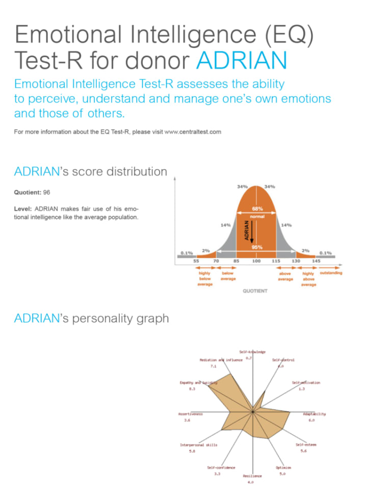 In the broadened profile of the donor most often appear the results of a personality test to identify his temperament is empathic? does he trust him? Is he booked or extroverted? rational or intuitive? Presented in the form of scores, curves, star graphs, the results facilitate the comparison between the donors. The use of a numerical language locating the person in relation to the “average” as well as the identification and the commentary of strengths and weaknesses express an evaluative intention which is based on a reference norm, that of a balanced masculinity, never explicitly defined. With this psychological information, the banks encourage their clients to see the donor as a person in their own right whose competition goes beyond the sale of biological material: because it embodies a human profile associated with its gametes, choose the “right partner” is crucial. According to the banks’ marketing discourse, the client/donor relationship must be thought of as a matching link whose issue goes beyond the sale of reproduction cells alone [1].