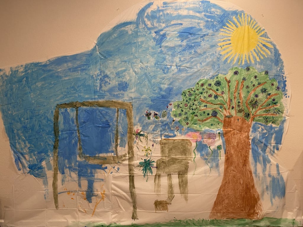 This was a hit and I am back to being the best mommy in the world! This mural was up for weeks, we slowly painted and enjoyed our masterpiece, even took a nice family photo with it as a background.