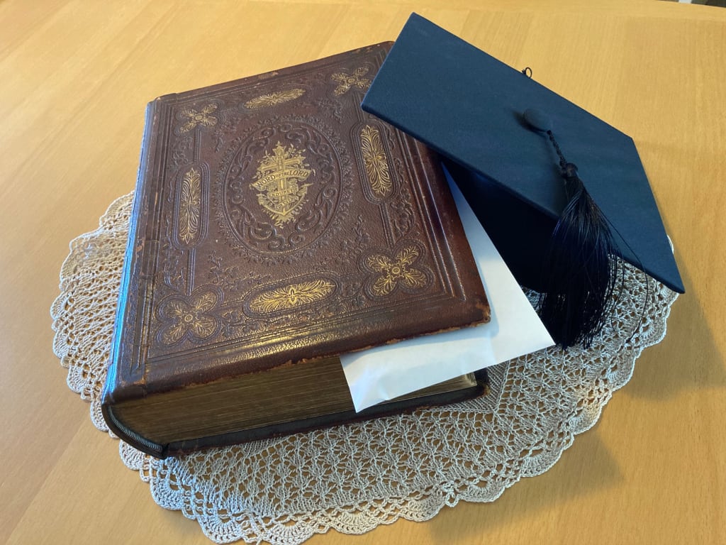 “Just let me give you this”, said his father unlocking the glass cabinet that kept his most precious collected works. “It was your grandfather’s most precious book but one I could never relate to”, said his father pulling out the old leather bound bible. “You are more like my dad than I ever was”, he said walking over and handing the heavy book to his son.