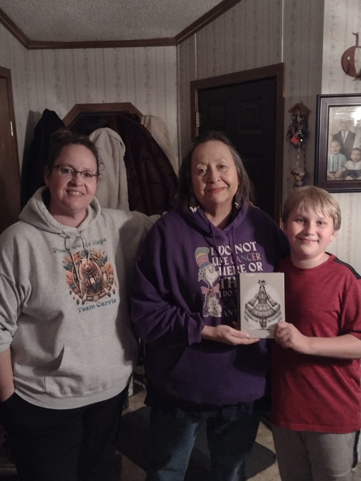 Grandchildren are always involved. At the 10-year-olds first fundraiser, he danced the entire powwow. Last year the nine-year-old made gift cards for sale and they were all sold. She is an artist, as is her mother, two sisters, and a brother.