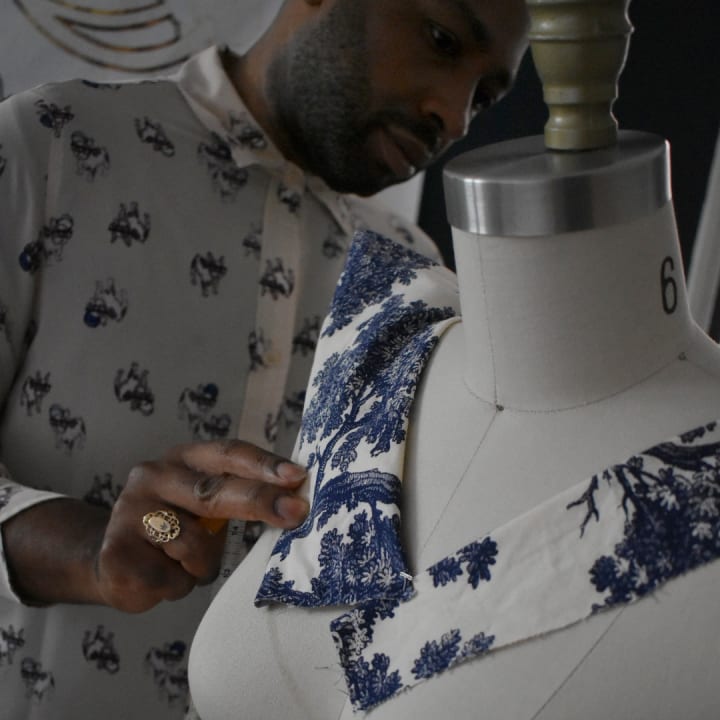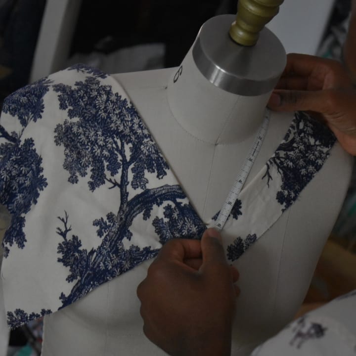 My backpack full of supplies bounces with each step along the pavement: tape measure, scissors, safety pins, laptop. I always have a pair of scissors handy, prepared to take a swatch of some new textile from whatever fabric shop will let me. I know all the best shops in city, and their staff members know me by name. I am thirty-six years old but remain at heart the eager pupil who marveled at a jar of countless mismatched buttons spread over newsprint on Momma Ruth’s floor, alternating my attention between her sewing and the Oprah Show. Oprah is off the air and I don’t do much sewing myself, but the power of dressing strong women still pulses in me.